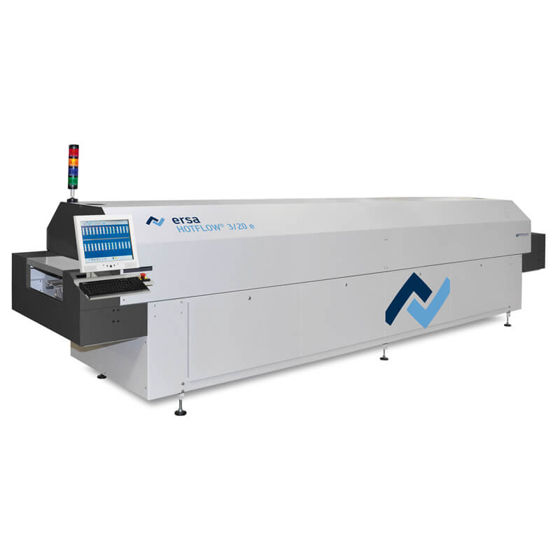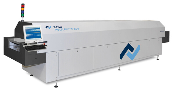 The Ersa HOTFLOW 3/20e Reflow System is of robust design and manufactured entirely from steel, welded air-tight, powder coated and with interior electric cabinet and a PC operating terminal. Features include the motorized hood opening, quick-change convection heater cassettes, multi-level process gas cleaning and a powerful and effective cooling zone.