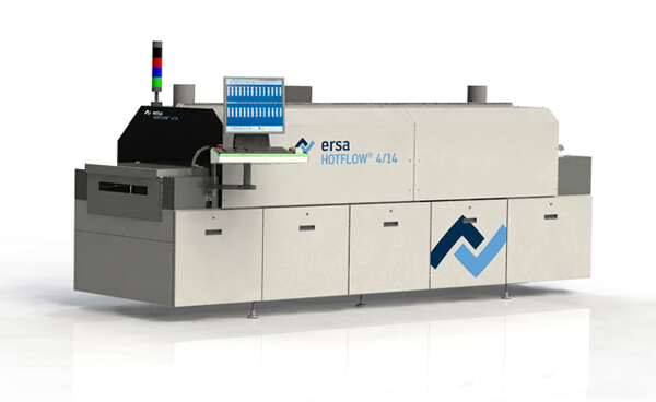 The Ersa HOTFLOW 4/14 Reflow Soldering System is of robust design and manufactured entirely from steel, welded air-tight, powder coated and with interior electric cabinet and a PC operating terminal. Features include the motorized hood opening, quick-change convection heater cassettes, multi-level process gas cleaning and a powerful and a high-performance cooling zone.
