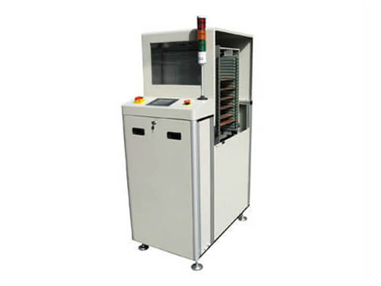 The Buffer Loader can be used as a mid-line loader or unloader, as a LIFO and FIFO buffer between SMD assembly, Connect with SMT and AI productions line. Straight-through may be selected so that PCB is conveyed by it, or Automatic may be selected so that this machine is used as a PCB buffer loader. (Automatic or Straight-through may be selected for this machine. When Automatic is selected and if the preceding machine is turning out PCB too fast but the following machine is feeding PCB too slowly, more PCB will be stored in this machine and sent out as long as the following machine needs it; When Straight-through is selected, this machine will be used as a conveying table.)