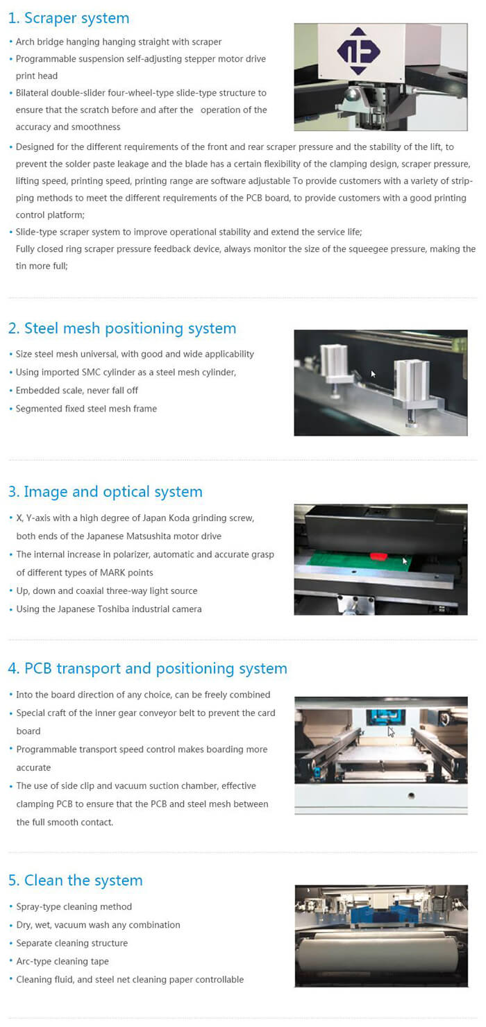 A Seriel SMT Stencil printer is high accuracy and high stability of the fully automatic printing machine vision,We followed in SMT industry is the development trend of production of a new generation of fully automatic printing machine with the international leading technology synchronous vision, visual processing of high resolution, high precision of the transmission system, suspension adaptive scraper.